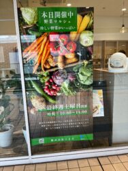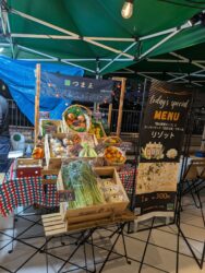2025(令和7)年6月29日 関東学院関内キャンパス内地下1階Bacon Books&cafe隣接「サンクンガーデン」にて17時まで野菜を販売しました。また「ハセベ屋台」では、つま正おすすめの「三方原のじゃがバター」や「旬の野菜スティック」を販売していただきました。このマルシェは、公式YouTubeチャンネル「有隣堂しか知らない世界」の5周年記念「ブッコロー1日店長!10時間密着生配信」に関連し、スクリーンで生配信を観ながら、こだわりのフードやドリンクをお楽しみいただくものでした。