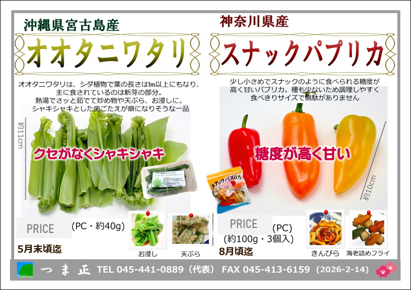 シャキシャキ食感の「オオタニワタリ」と使い切りサイズの国産「スナックパプリカ」です。